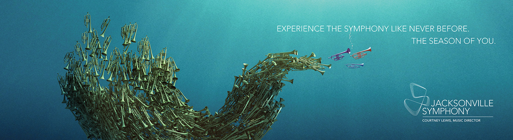 Objective: Create an image featuring a “school” of brass trumpets led by three solo trumpets, each bearing one of Jacksonville Symphony’s three colors. Process/Solution: An array of 900+ schooling trumpets were created in Maxon Cinema 4D using a single stock trumpet wireframe. The school was arranged into a visually pleasing and natural-looking “school” shape (no small feat). The three lead trumpets were colorized separately, then placed individually. The scene was lit in a diffused top-down fashion to match the direction and quality of the light source in the stock image being used for the background plate. The rendering of the school was then composited with the background plate in Adobe Photoshop and altered to give the school the appropriate feeling of depth and scale. The small stream of bubbles emanating from the purple trumpet was added as a final touch. Techniques: 3D modeling, texturing, lighting and rendering in Maxon Cinema 4D, compositing and illustration in Adobe Photoshop Acknowledgements: Agency: On Ideas Creative director: Chris Nott Art director: Tiffany Biziewski Photography: Stock